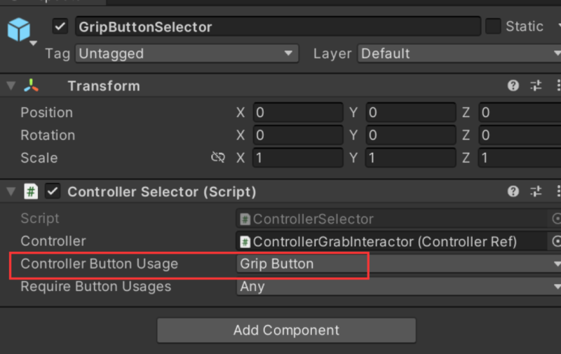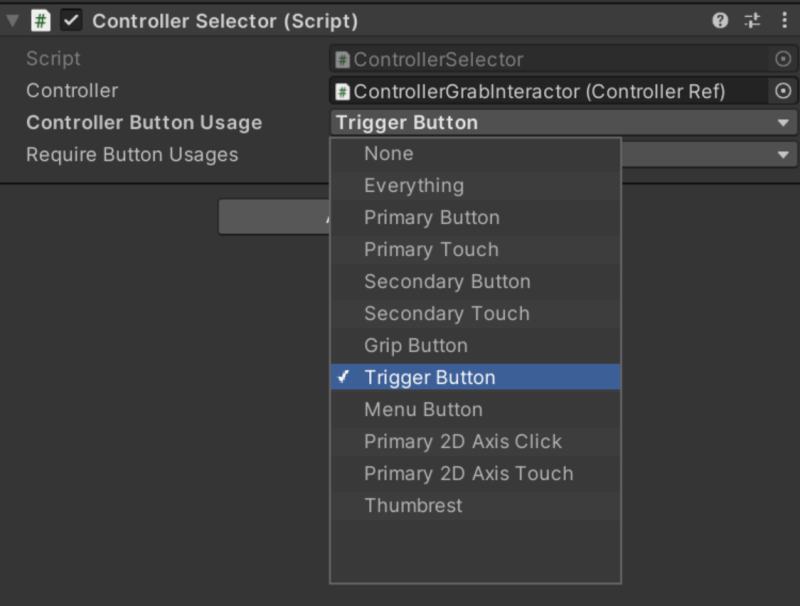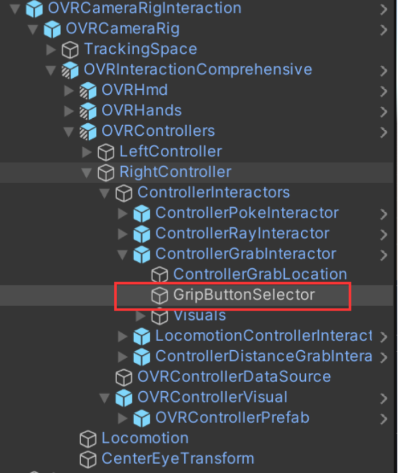 使用的 SDK:Meta XR SDK 找到玩家物体 OVRCameraRig 下的 GripButtonSelector 子物体(如图 1 所示,图中是 RightController 右手柄,另一只手柄同理,在 LeftController 下找),然后找到 GripButtonSelector 物体上 的 Controller Selector 脚本,修改 Controller Button Usage 参数(如图 2,3 所示)