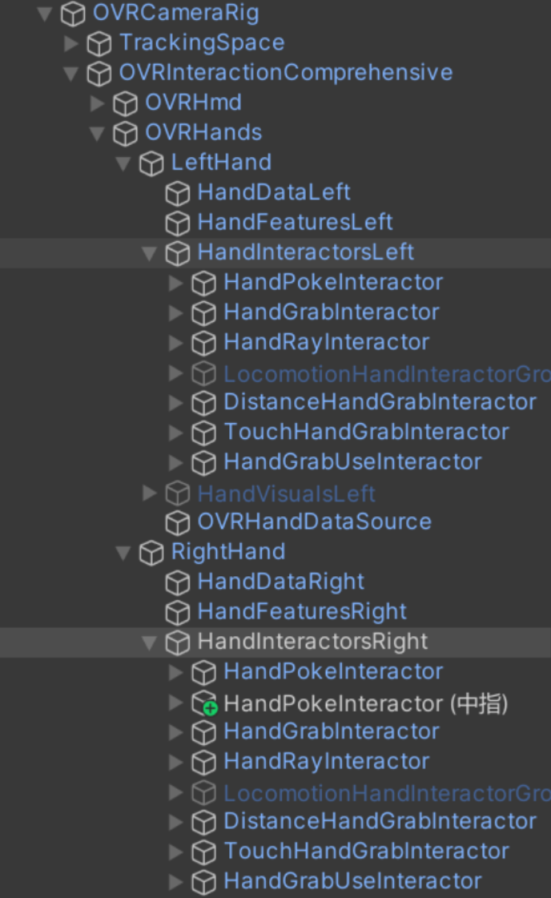 找到玩家物体 OVRCameraRig 下的子物体 HandInteractorsRight/Left(分别管理左右手的 Interactor)下的 HandPokeInteractor 子物体,将 HandPokeInteractor 物体复制并作为 HandInteractorsRight/Left 的子物体(可以选中物体按下键盘的 Ctrl + D),下面以给右手的中指添加 Poke 交互为例: