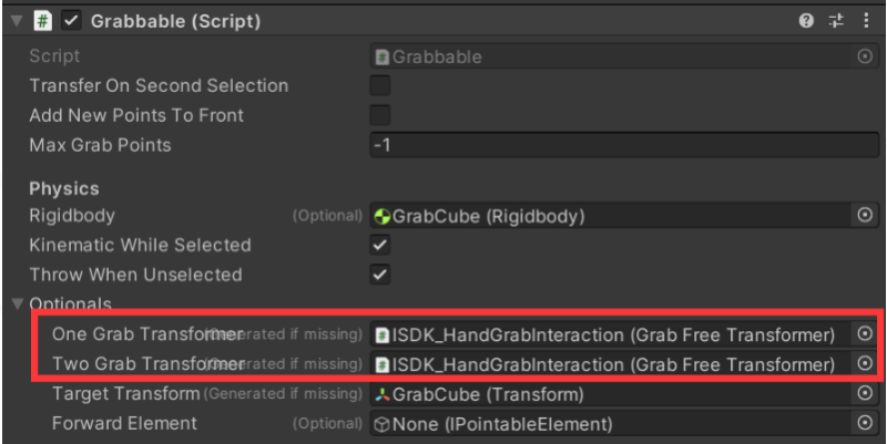 找到 Grabbable 脚本,把刚刚添加的 GrabFreeTransformer 脚本添加到 One Grab Transformer 参数上。如果要实现双手抓取,还需要把 GrabFreeTransformer 脚本添加到 Two Grab Transformer 参数上,并且取消勾选 Grabbable 脚本上的 Transfer On Second Selection 参数: