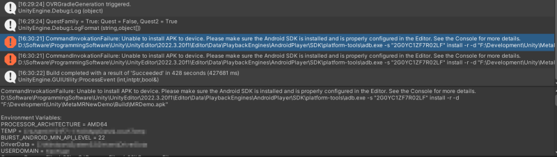 在 Unity 的 Build Settings 里点击 Build And Run,把程序打包成 APK 传输到头显中,遇到报错:CommandInvokationFailure: Unable to install APK to device.